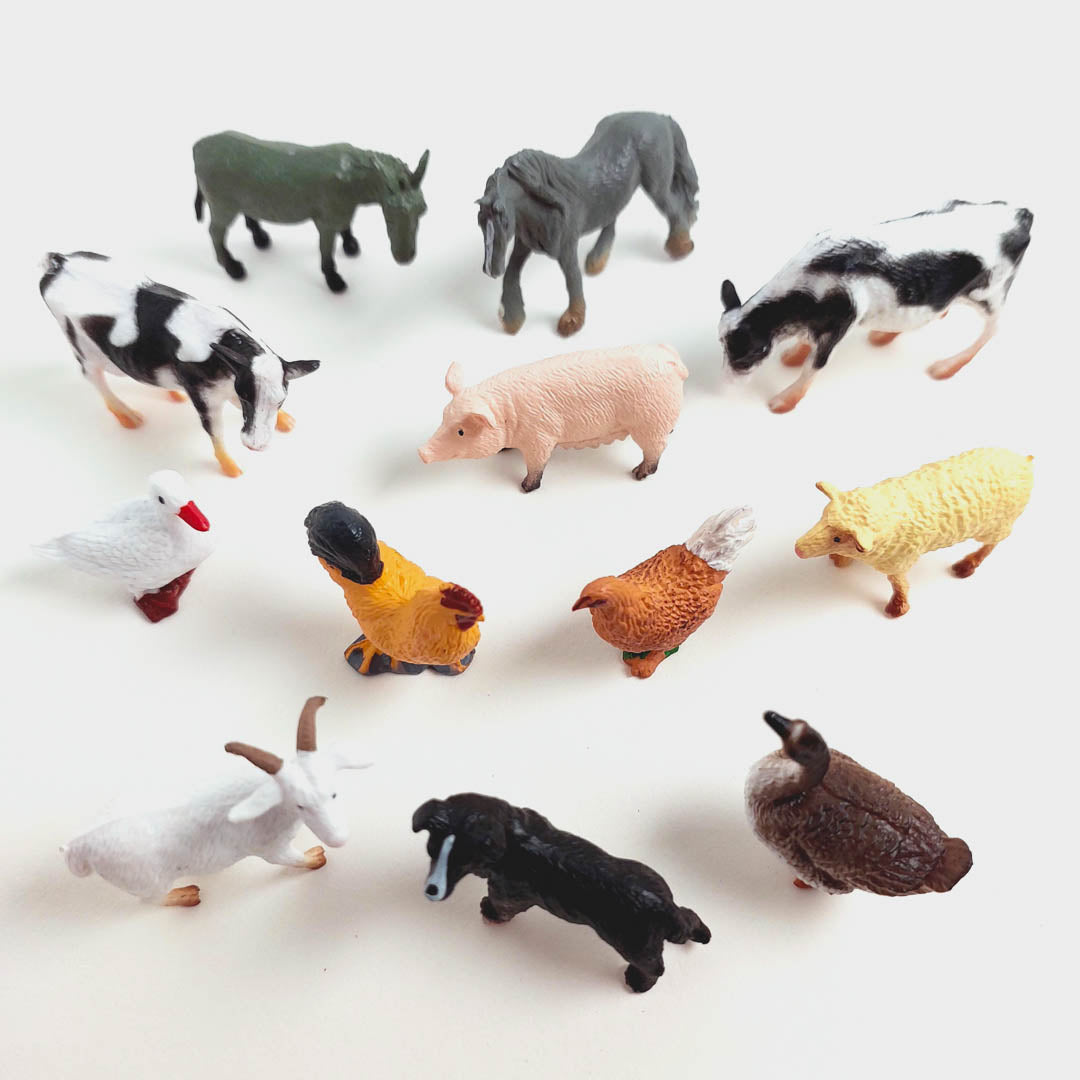 Play with 12 mini farm animals; Feed the cows, bathe the chicken, make the duck waddle, and many more. These 12 farm animals are great for teaching farm life, learning animal sounds, and creating your Farm Diorama.